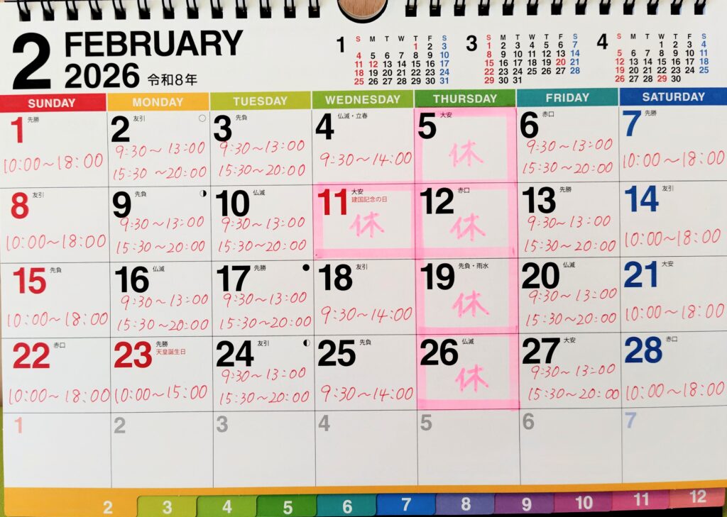 2026年2月の休院日は毎週木曜、11日(祝)となります。なお、2/23(祝)は10:00~15:00で営業致します。詳しくは下記カレンダーをご覧ください。